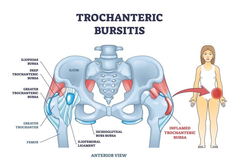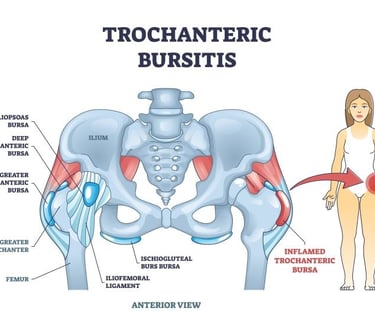 Trochanteric bursitis refers to inflammation of the bursa located over the greater trochanter on the outer aspect of the hip. The bursa acts as a fluid-filled cushion between bone and surrounding soft tissues, reducing friction—similar to protective “bubble wrap” for the joint.