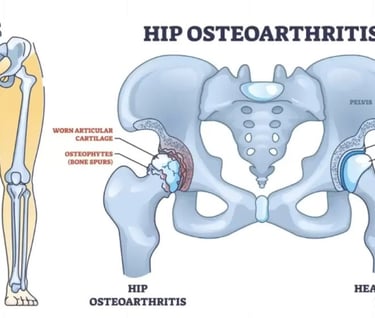 Hip osteoarthritis is a degenerative joint disease causing pain, stiffness, and reduced mobility in the hip by wearing away the protective cartilage that cushions the ball-and-socket joint. It's managed through a combination of self-care, such as weight management and exercise, and professional treatments like medication or injections, with surgery being an option for severe cases.