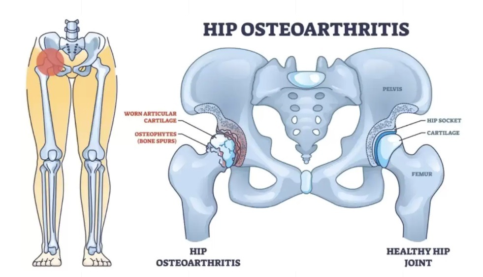 Hip osteoarthritis is a degenerative joint disease causing pain, stiffness, and reduced mobility in the hip by wearing away the protective cartilage that cushions the ball-and-socket joint. It’s managed through a combination of self-care, such as weight management and exercise, and professional treatments like medication or injections, with surgery being an option for severe cases.